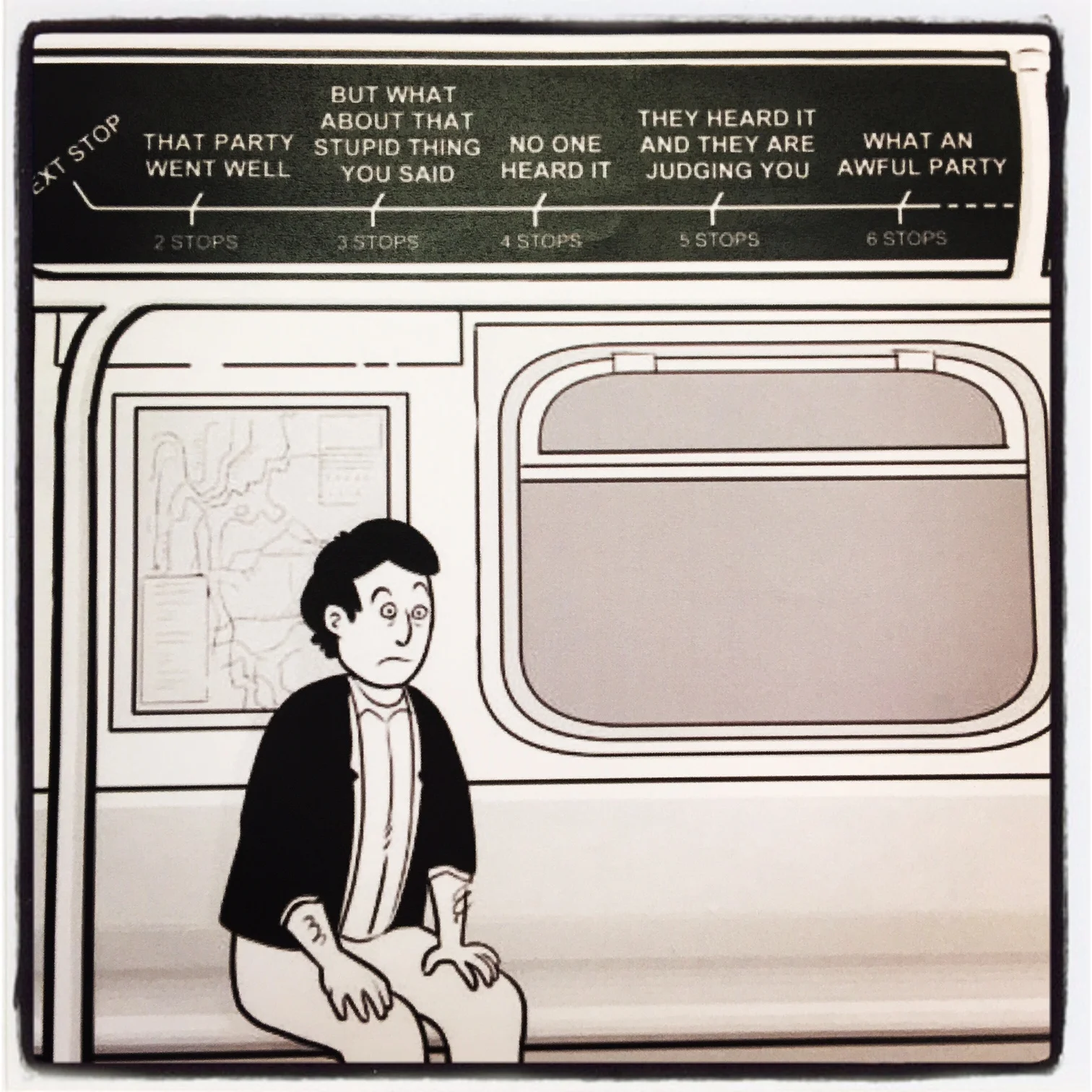 In this cartoon, there is a gentleman on the subway who feels real good about his experience at a party he went to. Then a few stops later he wonders if someone misunderstood something he said. By the end of his journey, his train has gone all the way to crazy-town and he is convinced that he is the world’s biggest loser, that he made the biggest fool of himself at the party, and that no one would ever want to hang out with him ever again.
